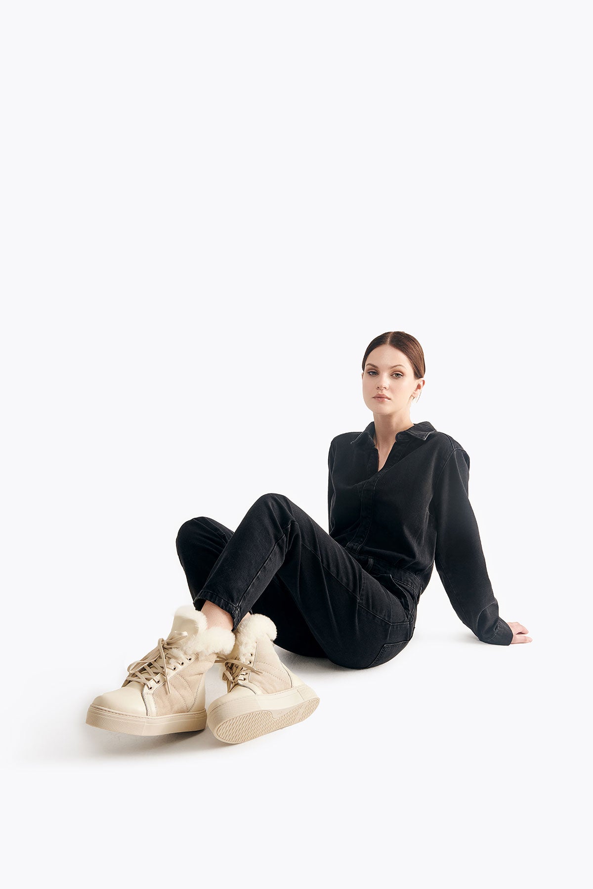 Vores Leira-støvler har luksuriøst fåreskindsmateriale for maksimal komfort og varme. Gummiydersålen sikrer holdbarhed og stabilitet, mens fåreskindsfodringen giver overlegen isolering. Derudover kan du vælge at bære dem enten rullet op eller ned, så du får alsidige stylingmuligheder.