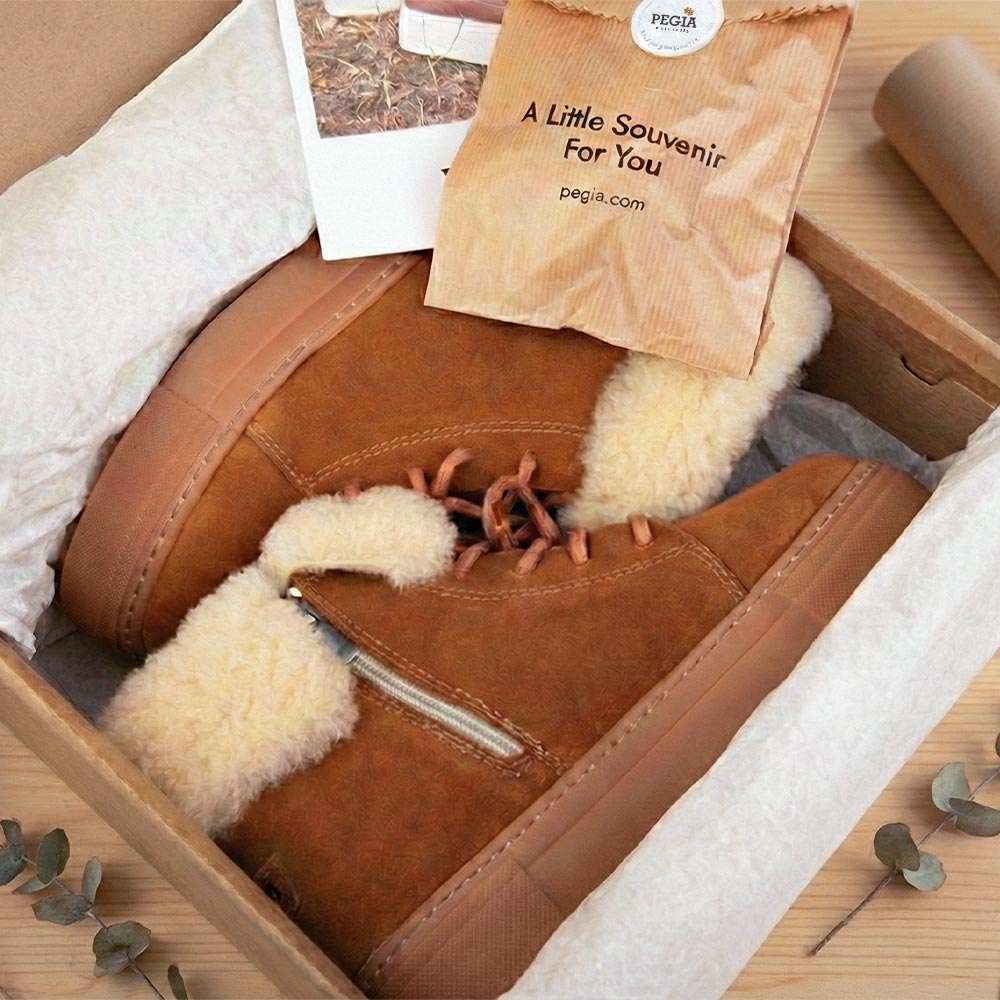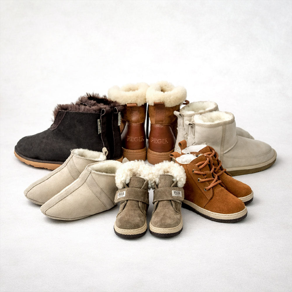 शीपस्किन बूट्स: पेगिया का सिग्नेचर कलेक्शन; असली शीपस्किन के यूनिसेक्स स्टाइल जो टिकाऊपन को सर्दियों की शान के साथ मिलाते हैं।