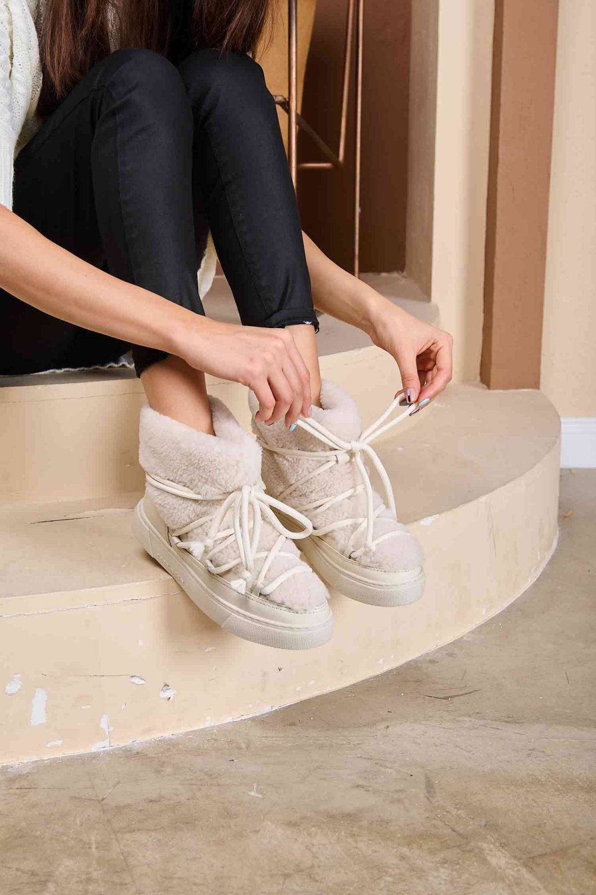 Ervaar ongeëvenaard comfort en stijl met de Cool Moon Devon dameslaars van echt schapenvacht. De binnenkant van deze prachtige laarzen is gevoerd met echt schapenvacht voor ongeëvenaarde warmte en gezelligheid. De buitenkant is gemaakt van echt leer en heeft een uniek pluche bontontwerp voor een vleugje luxe en verfijning. Decoratieve veters dragen bij aan de esthetische aantrekkingskracht, waardoor deze laarzen een opvallende toevoeging aan je garderobe zijn.